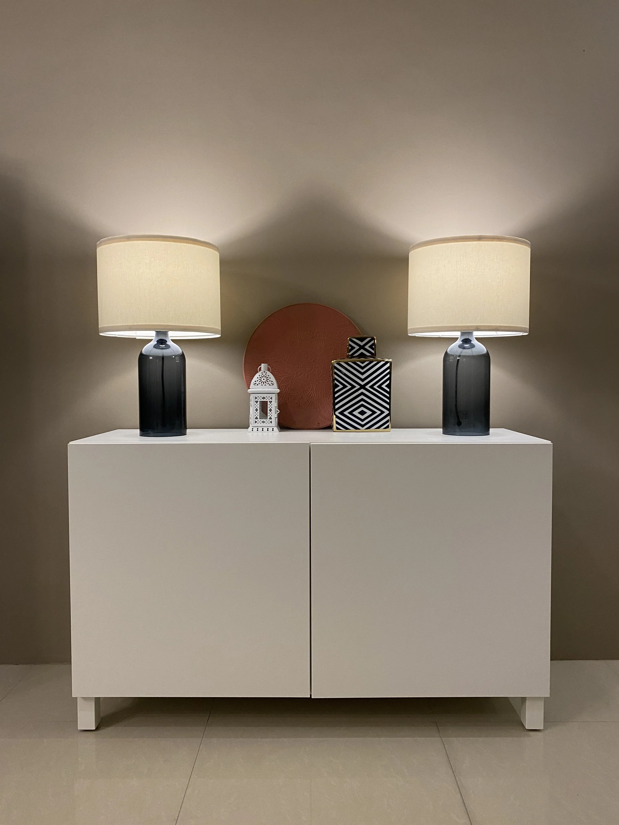 Modern white cabinet with two tabletop lamps, a decorative lantern, geometric patterned box, and circular wall art.