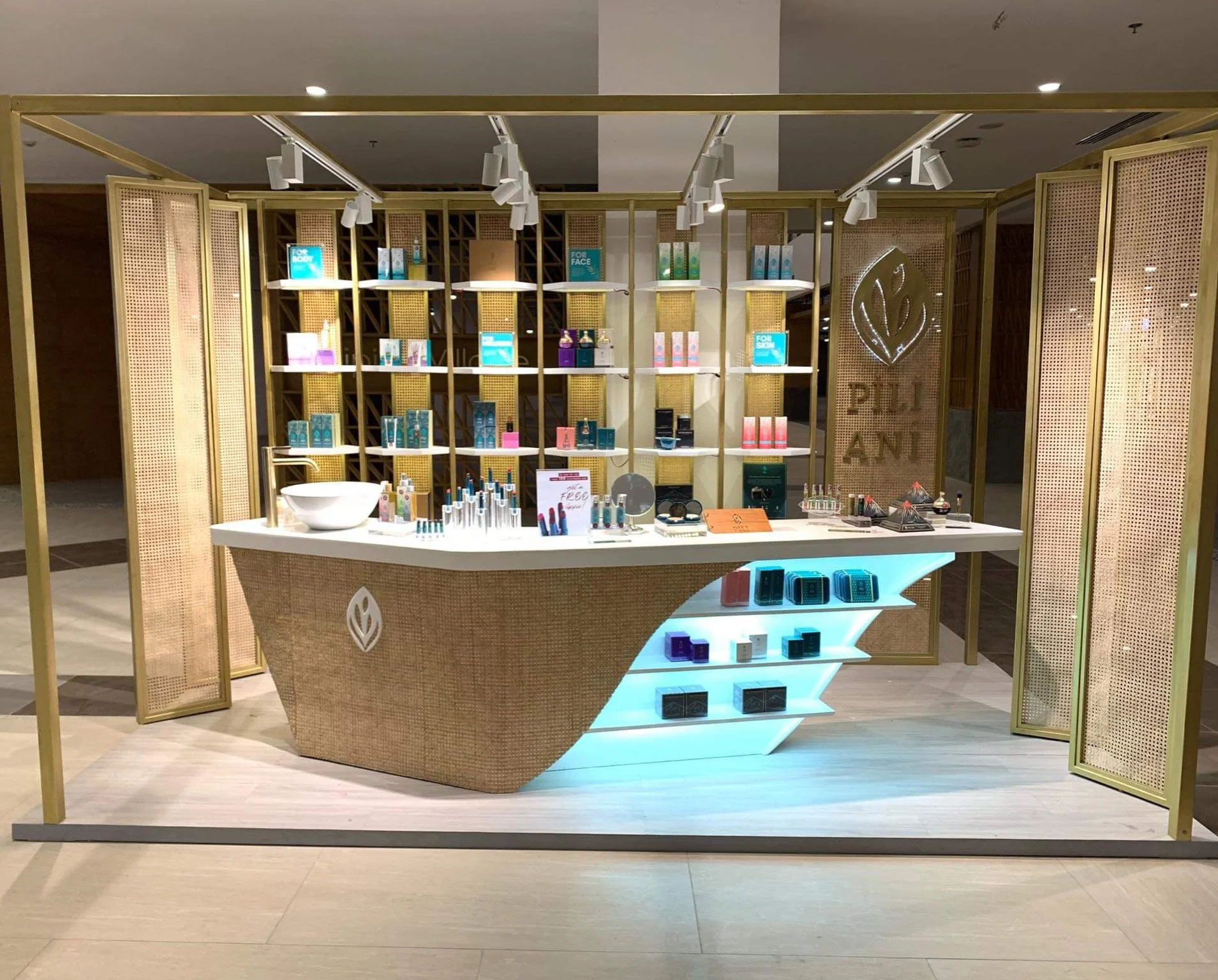 A modern skincare product display booth with a variety of cosmetics and skincare products on shelves and counter, featuring wood and metal accents. The booth has the logo and brand name "Pili Ani" prominently displayed.